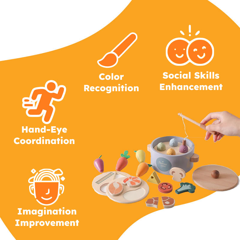 This isn’t just another play kitchen — it’s a Montessori-inspired set that turns pretend cooking into real learning. Made from natural wood with child-safe paint, it helps kids explore counting, colors, food names, and healthy eating through hands-on play.