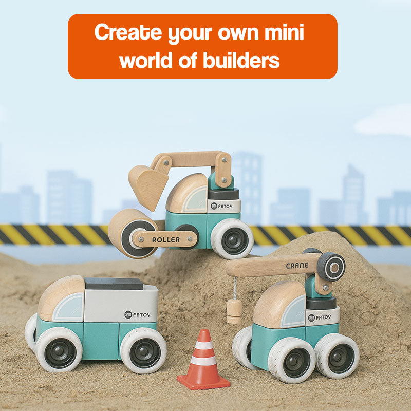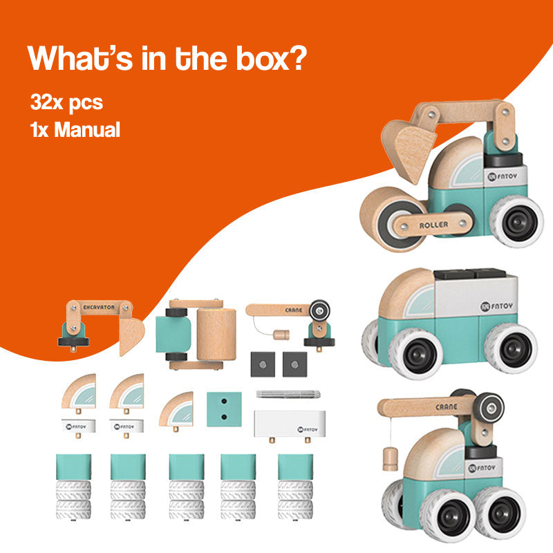 Build 6 different construction vehicles with rubberwood pieces that snap together securely. A screen-free engineering adventure combining natural materials with modular design that teaches problem-solving through play.
